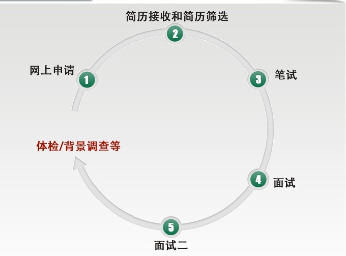 按照發布公告、網上報名、資格審核、筆試(專業素質測試)、面試、背景調查、體檢、錄用等程序進行。