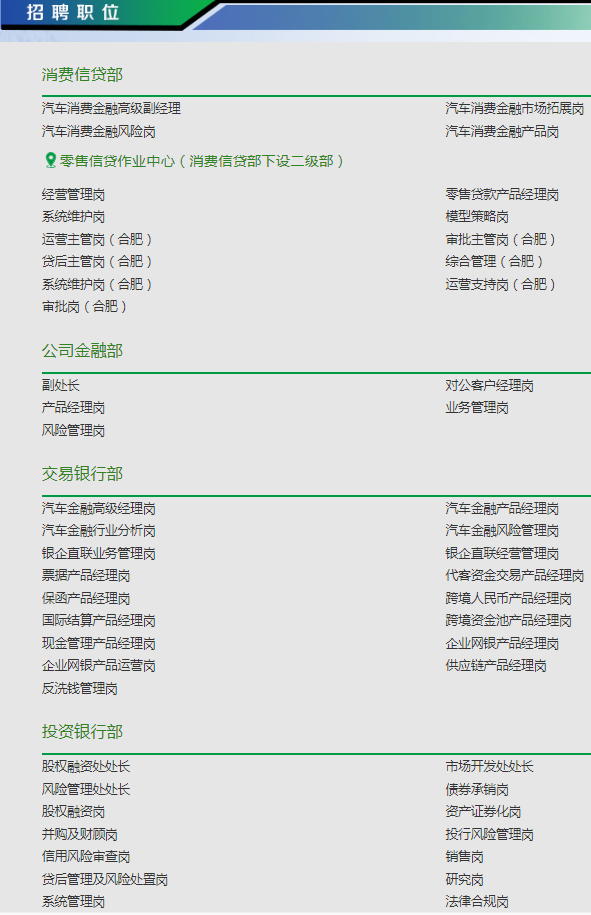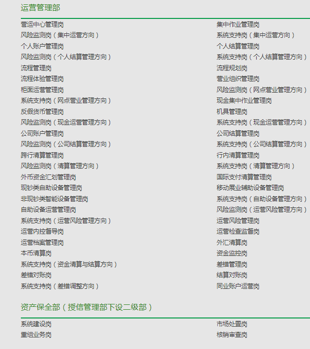 中國郵政儲蓄銀行總行消費信貸部、公司金融部、交易銀行部、投資銀行部、運營管理部、資產(chǎn)保全部(授信管理部下設二級部)。