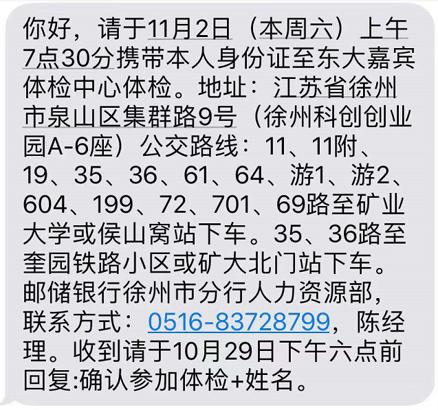 2020年中國郵政儲蓄銀行徐州市分行體檢通知公告
