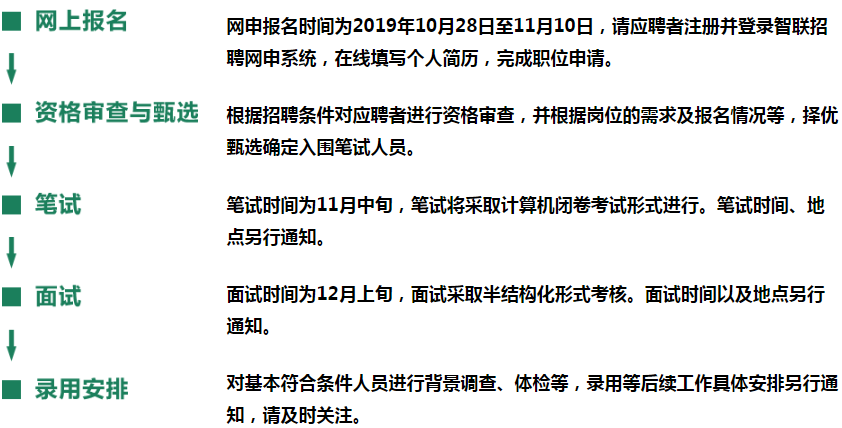 網申報名時間為:2019年10月28日?11月10日,請應聘者注冊并登錄智聯招聘網申系統(http://gdyc.zhaopin.com/),在線填寫個人簡歷,完成職位申請。