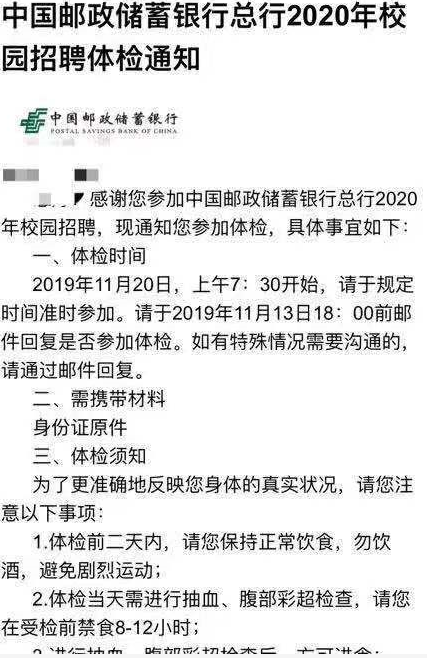 [北京]2020中國郵政儲蓄銀行總行校園招聘體檢通知