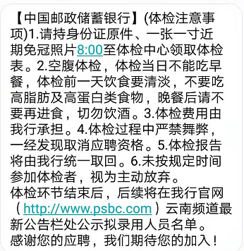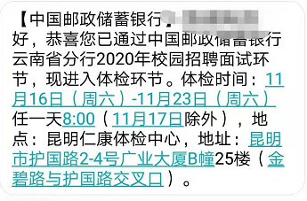 [云南]2020中國郵政儲蓄銀行云南分行校園招聘體檢通知