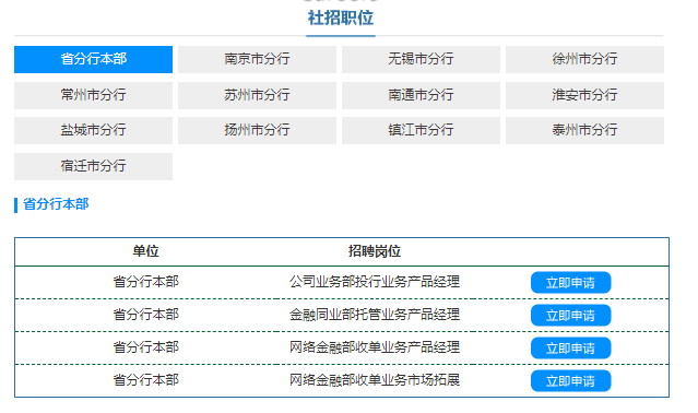 招聘崗位主要是省分行專業類崗位,地市分行管理類、專業類、銷售類等崗位。