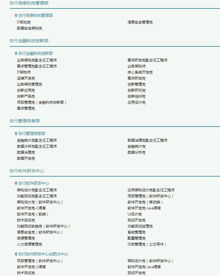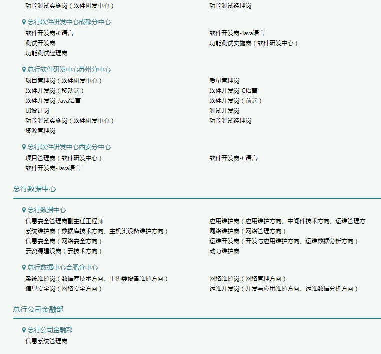 中國(guó)郵政儲(chǔ)蓄銀行總行信息科技管理部、金融科技創(chuàng)新部、管理信息部、軟件研發(fā)中心、數(shù)據(jù)中心、公司金融部(信息系統(tǒng)管理崗)。