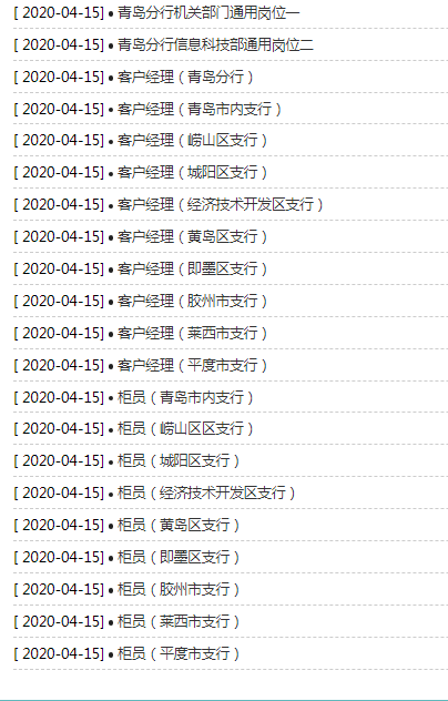 本次招聘涉及青島分行及下轄各區市支行通用崗位(包含專業類、銷售類崗位)、柜員崗位等。具體招聘崗位詳見職位發布頁面。