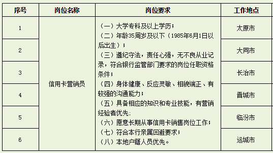 招錄單位為山西佳鑫人力資源管理咨詢服務有限公司,以勞務用工形式派遣至中國郵政儲蓄銀行太原市分行、大同市分行、長治市分行、晉城市分行、臨汾市分行、運城市分行,專職從事信用卡業務外拓營銷工作。