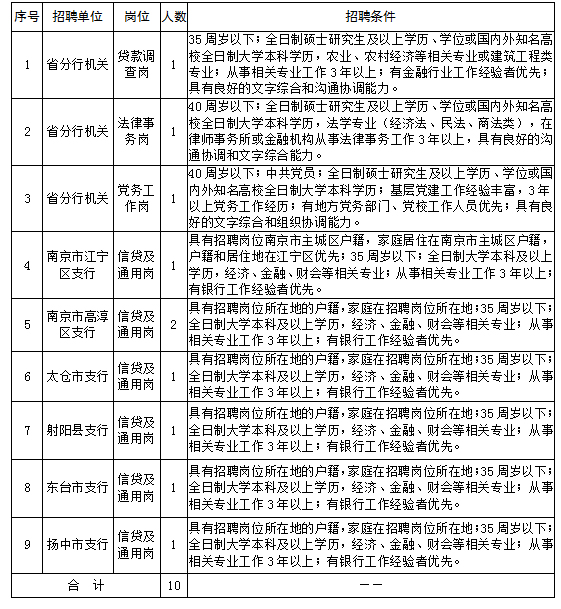 招聘單位包括省級分行機關、部分縣級支行,招聘崗位共有10個,具體招聘崗位及資格條件見下表: