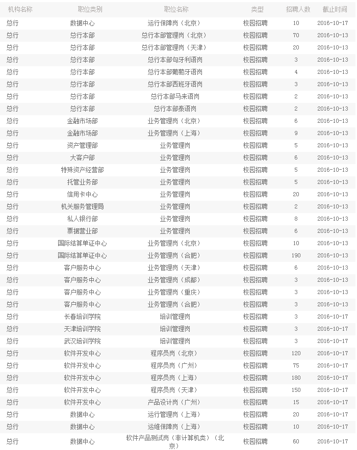 2.報名時間:9月28日-10月13日(其中軟件開發中心,數據中心,長春、天津、武漢培訓學院崗位報名時間為9月28日-10月17日)。