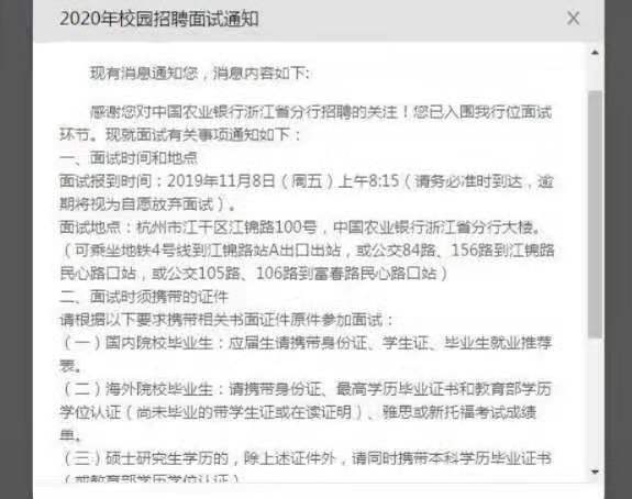 【中國農業銀行】尊敬的xxx:農行浙江省分行2020年校園招聘面試通知已經發出,面試時間為2019年11月8日至10日,請盡快登錄農行招聘官方網站(https://career.abchina.com)查看相關信息。