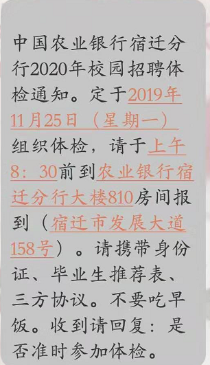 [安徽]2020中國農業銀行宿遷分行校園招聘體檢通知