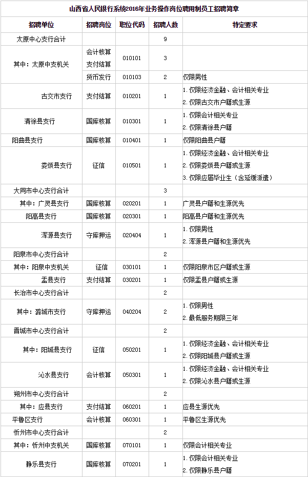 10.招聘單位另有要求的,詳見《山西省人民銀行系統2016年業務操作崗位聘用制員工招聘簡章》中“特定要求”。