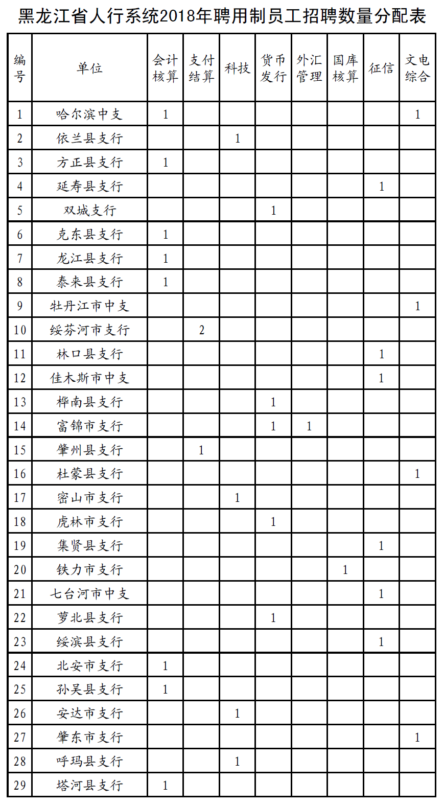 黑龍江省人民銀行分支機(jī)構(gòu)2018年業(yè)務(wù)操作崗聘用制員工招聘工作,F(xiàn)將有關(guān)事項(xiàng)公告如下: