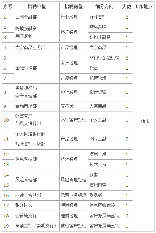 根據(jù)業(yè)務(wù)發(fā)展需要,中國(guó)銀行股份有限公司上海市分行(以下簡(jiǎn)稱(chēng)“中國(guó)銀行上海市分行或我行”)部分職位面向社會(huì)公開(kāi)招聘,現(xiàn)就有關(guān)招聘事宜公告如下: