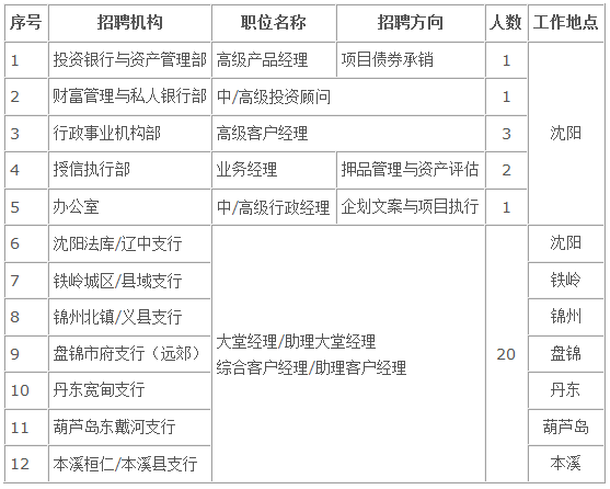 根據(jù)業(yè)務(wù)發(fā)展需要,中國銀行股份有限公司遼寧省分行(以下簡稱“中國銀行遼寧省分行或我行”)部分職位面向社會(huì)公開招聘,現(xiàn)就有關(guān)招聘事宜公告如下: