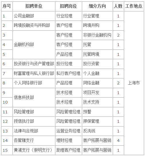 根據業務發展需要,中國銀行股份有限公司上海市分行(以下簡稱“中國銀行上海市分行或我行”)部分職位面向社會公開招聘,F就有關招聘事宜公告如下: