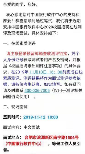 2020年中國銀行軟件中心安徽分行校園招聘在線測評及現場面試通知公告