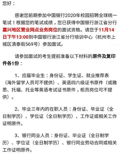 [浙江]2020年中國銀行浙江省分行校園招聘面試公告