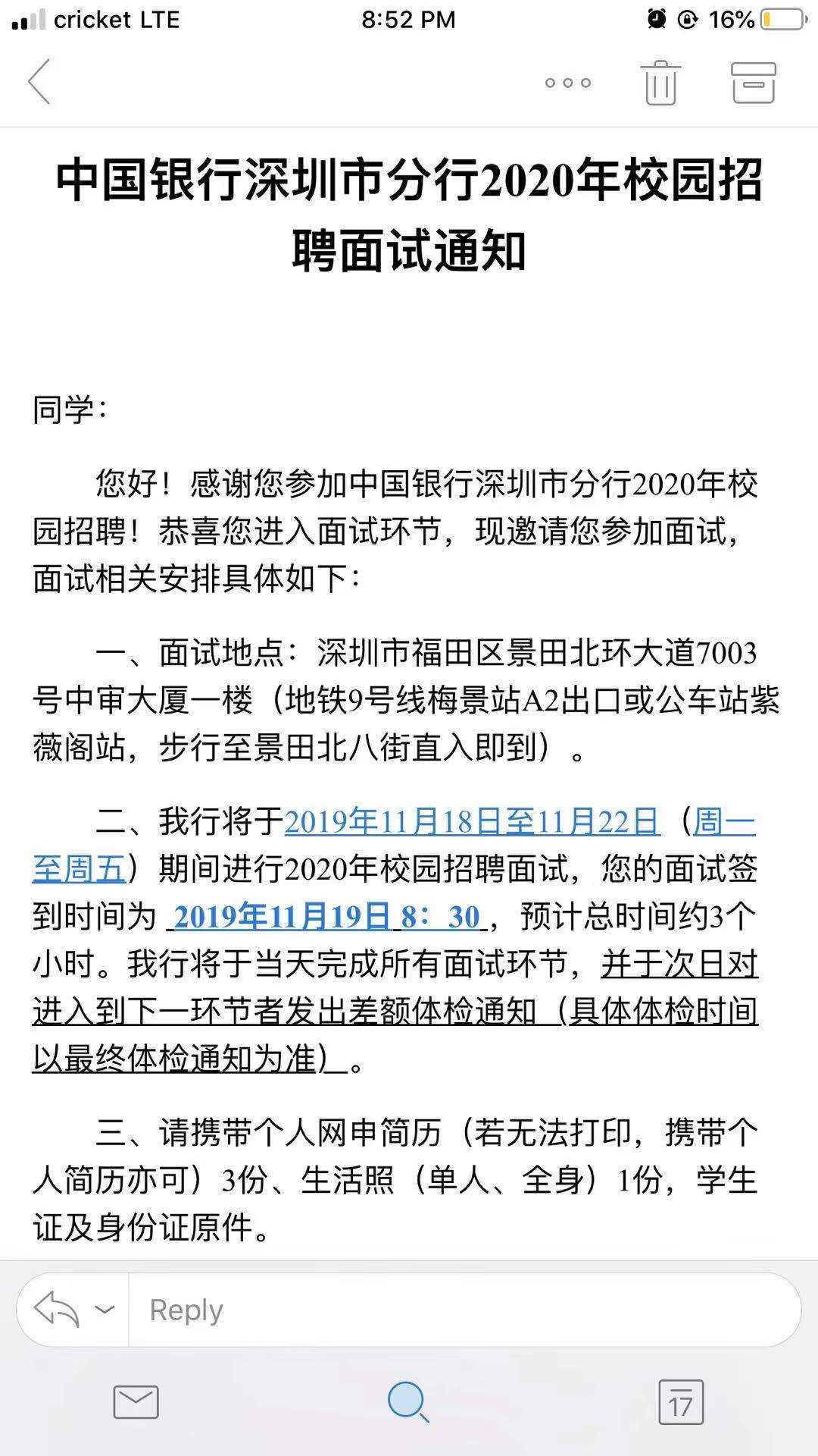 [廣東]2020中國銀行深圳分行校園招聘面試通知