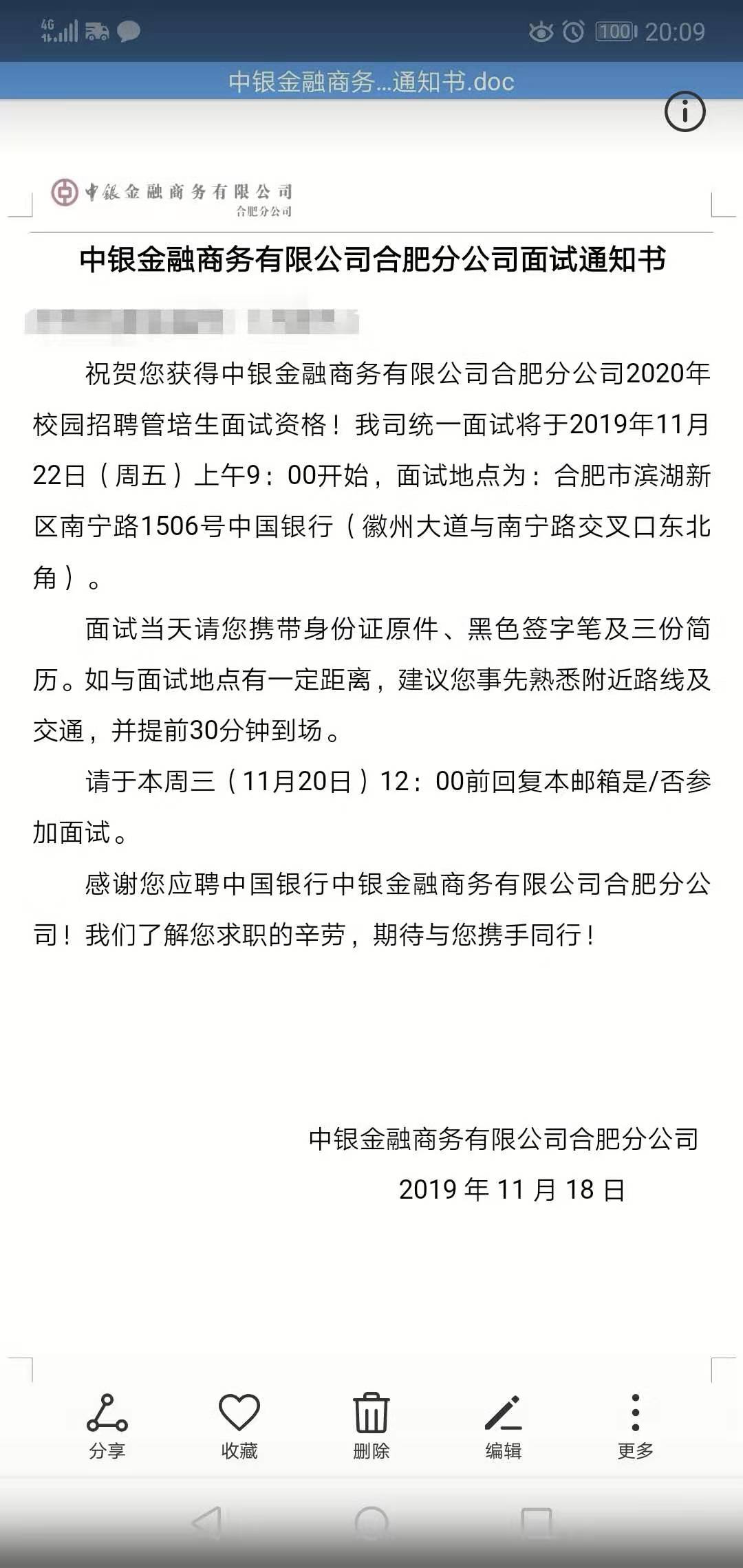 2020年中銀金融商務合肥分公司校園招聘面試通知
