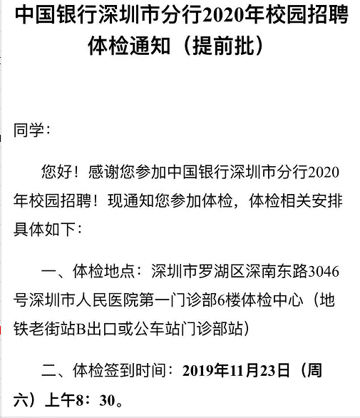 2020年中國銀行深圳分行(提前批)校園體檢通知