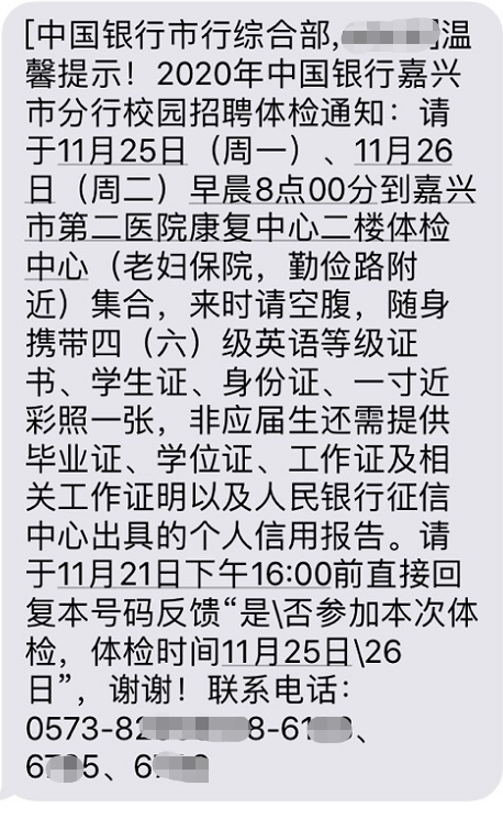[浙江]2020中國銀行嘉興分行校園招聘體檢通知