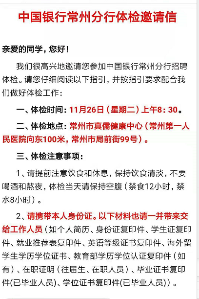[江蘇]2020中國銀行常州分行校園招聘體檢通知公告