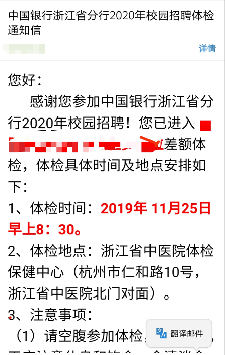 [浙江]2019年中國銀行浙江分行校園招聘體檢通知