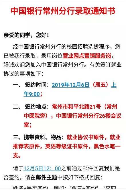 [江蘇]2020中國銀行常州分行校園招聘錄取通知書