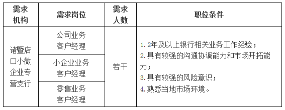 現因業務發展需要,現向諸暨市范圍內招聘公司業務、小企業業務、零售業務客戶經理。