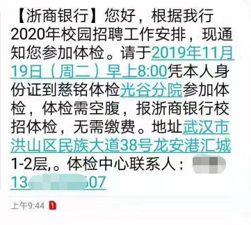 [湖北]2020年浙商銀行武漢分行校園招聘體檢通知