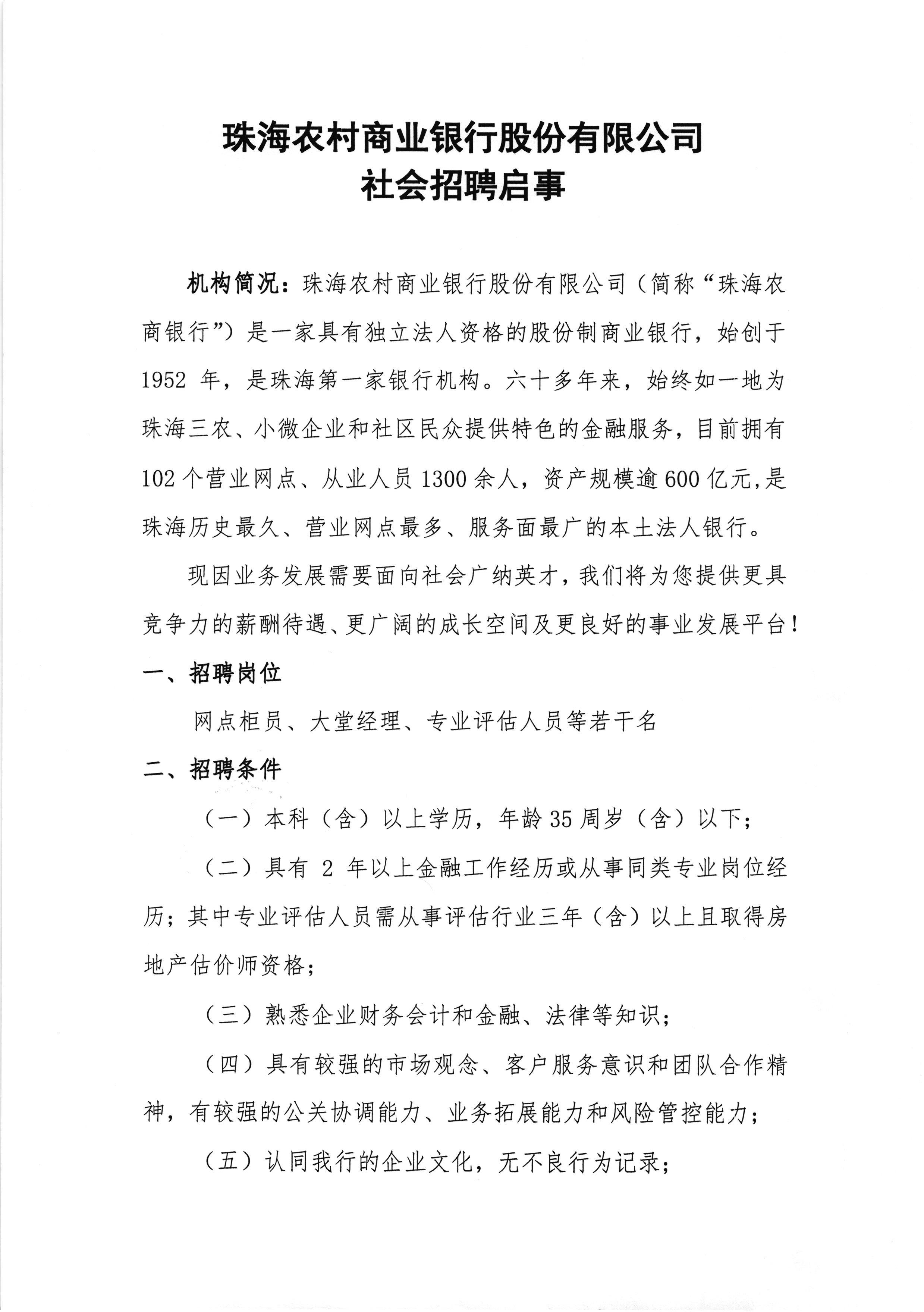 [廣東]2019珠海農村商業銀行社會招聘啟事