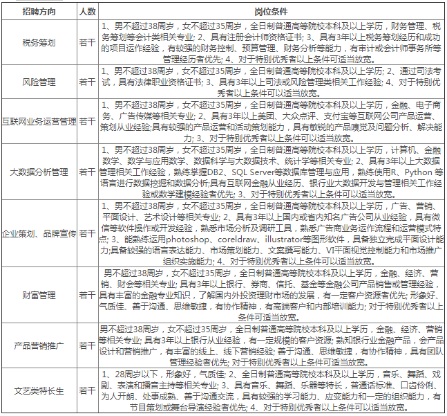 擬招聘稅務籌劃、風險管理、互聯網業務運營管理、大數據分析管理、企業策劃、財富管理、產品營銷推廣和文藝類特長生等專業人才若干名。