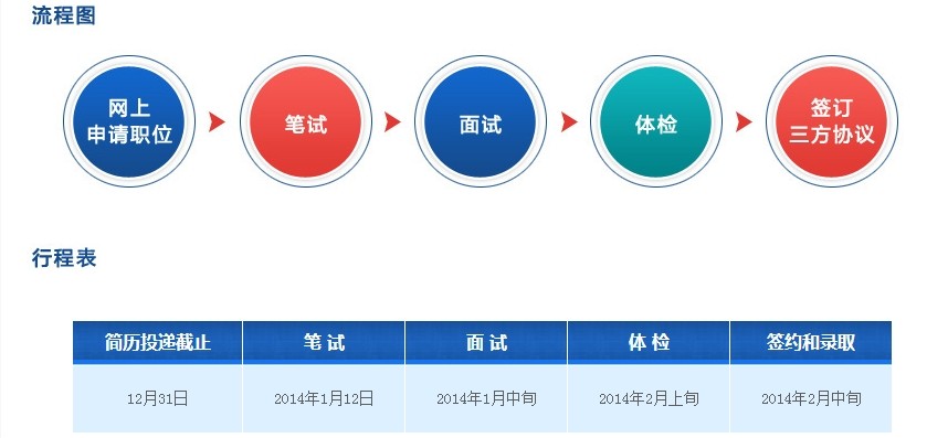 招聘程序包括網上報名、初選、統一筆試、面試及體檢、錄用簽約等步驟。