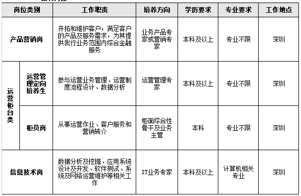 秉承“文化育人、事業留人、制度選人”的理念,深圳分行一直為廣大青年學生的發展成長創造良好環境,為招行系統培養了一大批優秀的管理骨干和業務骨干。為加強員工隊伍建設,為深圳分行可持續發展提供充足的人才資源,現面向全國高校招聘2018屆全日制普通高等院校畢業生和海外歸國留學生,具體如下: