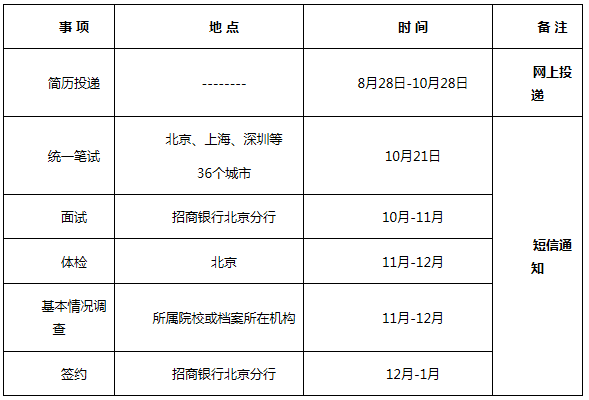 請登錄招商銀行官方招聘網站:http://career.cloud.cmbchina.com/index.html(選擇“登錄”進行注冊,注冊完畢后點擊“校園招聘”- “最新招聘職位”),選擇北京分行發布的相應職位投遞電子簡歷,按要求詳細填寫各項信息將是你應聘成功的基礎。
