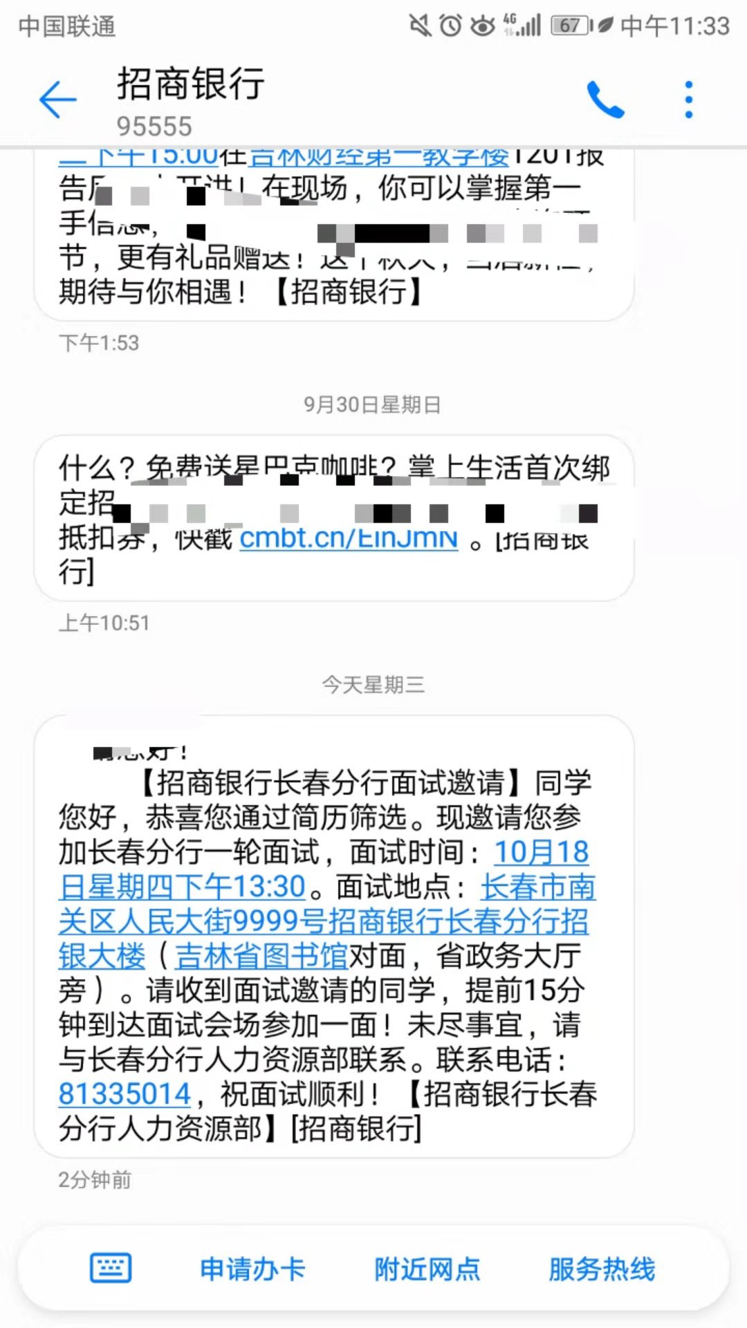 [吉林]2019年招商銀行長春分行校園招聘面試通知