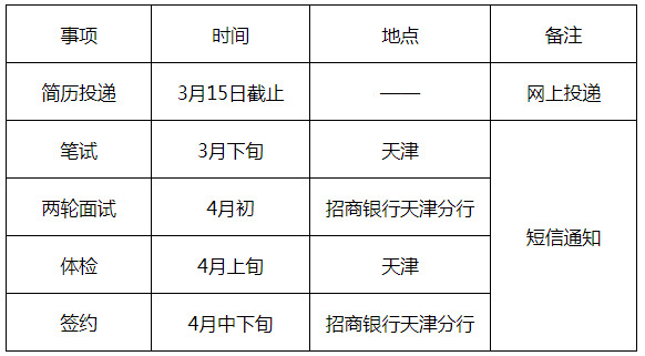 1.官方網(wǎng)站:登錄招商銀行官方招聘網(wǎng)站career.cmbchina.com,點(diǎn)擊“校園招聘”,查看天津分行招聘職位,投遞簡歷。