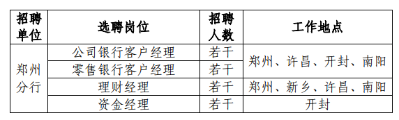 應聘條件:35 周歲及以下,全日制本科及以上學歷,具有 2 年以上零售銀行客戶經理工作經歷;熟悉銀行各類零售金融產品、業務操作流程以及相關業務政策法規;有較強的市場開拓能力、社會活動能力、營銷意識、風控合規能力。