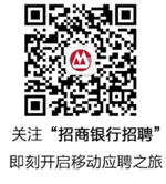 2、官方微信:掃描下方二維碼,關(guān)注“招商銀行招聘”微信公眾平臺,申請感興趣的職位,投遞簡歷!關(guān)注后,校園宣講,筆試、面試等安排第一時間獲取!