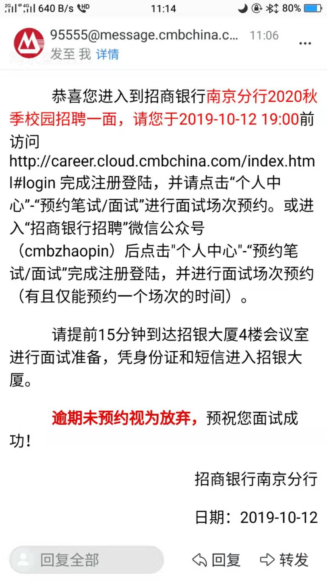 [江蘇]2020招商銀行南京分行校園招聘第一輪面試通知