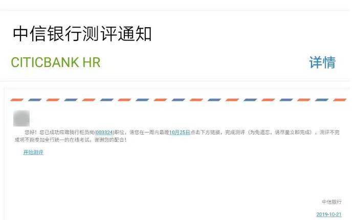 主頁 > 商業銀行招聘 > 中信銀行招聘 > [全國]2020中信銀行校園招聘測評通知