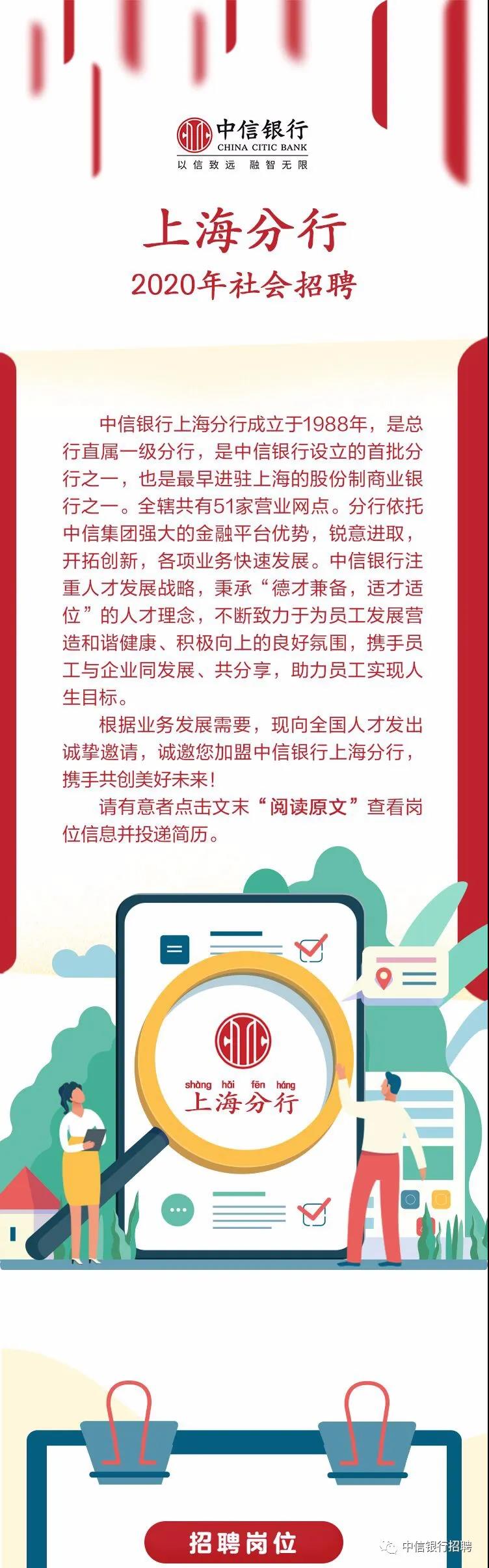 首頁 > 商業銀行招聘 > 中信銀行招聘 > [上海]2020年中信銀行上海分行社會招聘公告